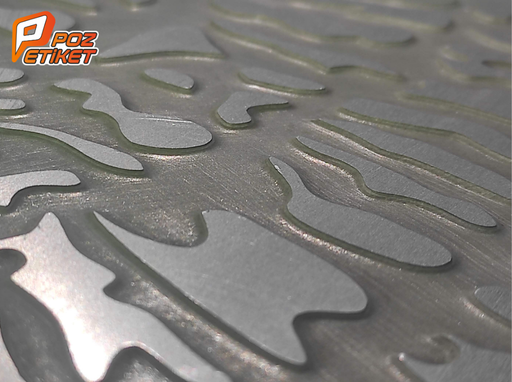 Asit İndirme Etiket, metal yüzey üzerine asit kullanılarak oyma işlemi yapılmasıyla üretilir. Asit, etiketin belirlenen alanlarını aşındırarak grafiklerin, yazıların veya logoların metal üzerinde kalıcı olarak yer almasını sağlar. Bu teknik, özellikle dış mekan koşullarına dayanıklı etiketler üretmek için tercih edilir. Asit indirme yöntemi, alüminyum, pirinç, paslanmaz çelik ve bakır gibi metaller üzerinde uygulanabilir.